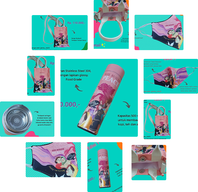 Dengan membeli berbagai produk She Builds Peace Indonesia, kamu turut berkontribusi dalam gerakan kami